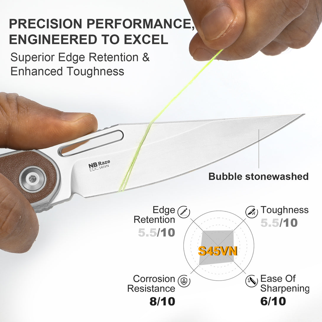 Crafted from S45VN steel, this blade holds an edge longer (60-61 HRC) and offers greater durability than previous generations. The addition of niobium refines the steel's structure, boosting corrosion resistance and making sharpening simpler. Perfect for tactical, outdoor, or everyday carry—this steel won’t let you down.