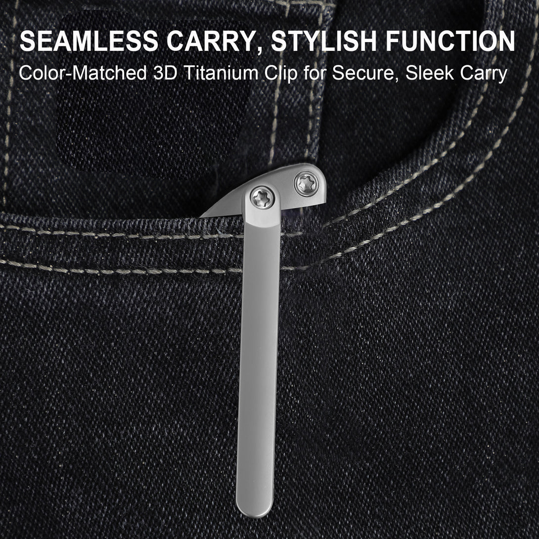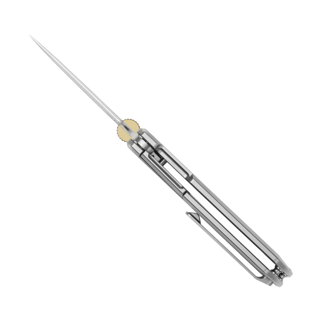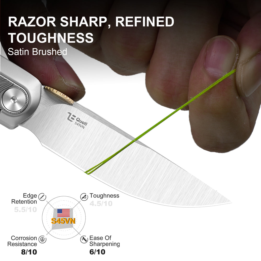 The Quoll has a lightweight, precision titanium handle with modular inlays for personalized style and easy swapping, fostering a sharing community. Variants feature Rainbow Damascus, Crystallized Titanium, Titanium Damascus, or textured zirconium inlays, meeting diverse style preferences.