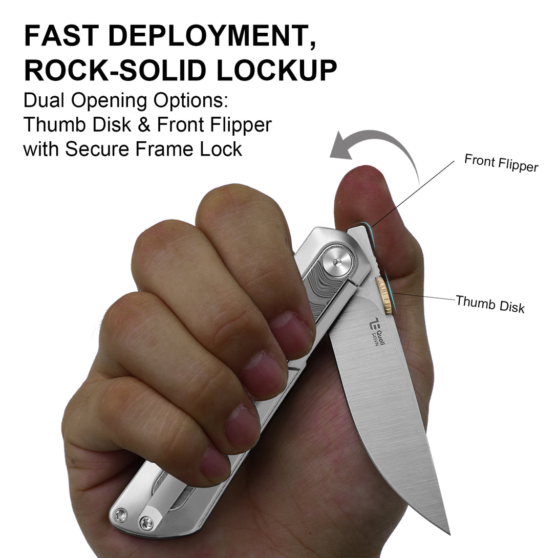 The Quoll offers fast one-hand opening via thumb disk and front flipper. Brass or titanium disks match each inlay’s color for a refined, unified look.A sturdy frame lock ensures secure, reliable use.