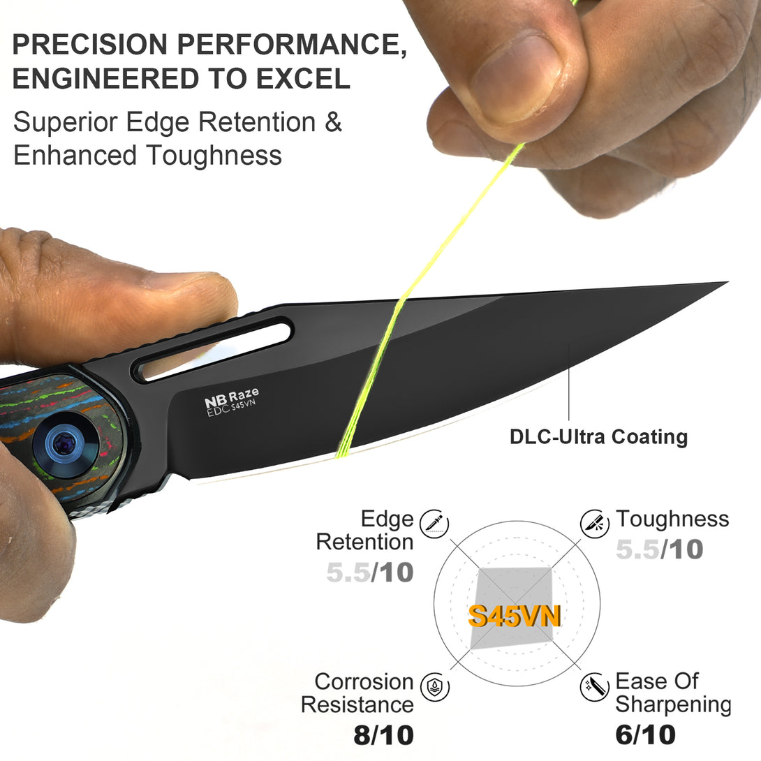 S45VN steel delivers exceptional edge retention (HRC 60-61) and improved toughness over its predecessor, making it ideal for demanding cutting tasks. With added niobium for refined grain structure, it offers better corrosion resistance and easier sharpening. Whether for Operational, outdoor, or EDC use, S45VN ensures long-lasting performance.