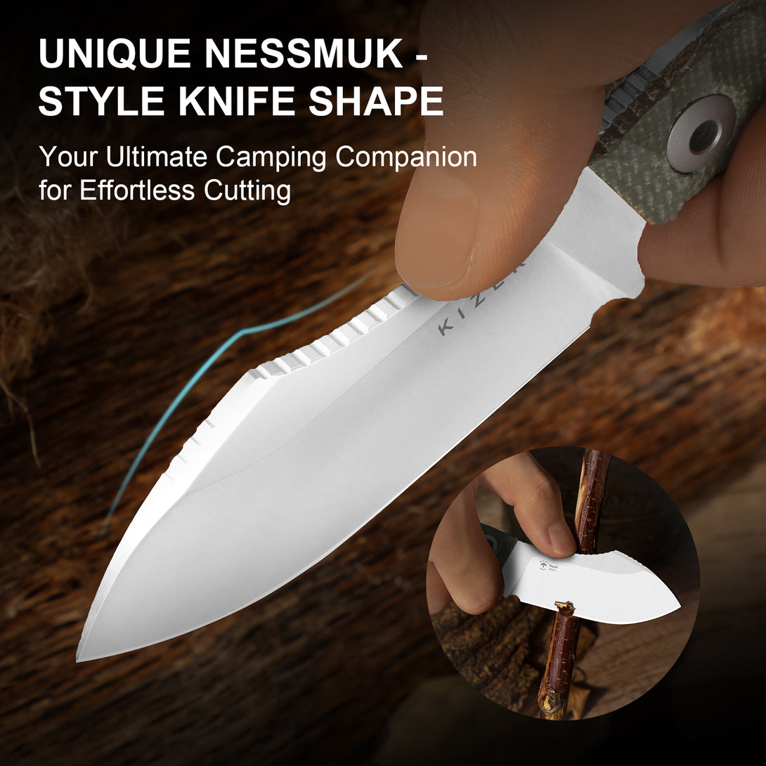 An evolution of the classic drop point, our Nessmuk-style blade combines three distinctive features: a pronounced hump behind the tip, a deeply curved belly, and an upswept point. This refined geometry excels in various outdoor tasks, whether it's precisely handling food preparation, effortlessly skinning game, or processing tinder. It's the ultimate all-purpose cutting tool designed for wilderness use.