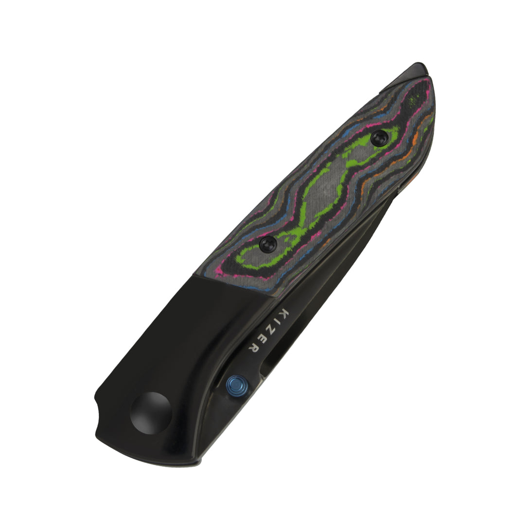Polished DLC-Ultra titanium handle paired with camo carbon 80’s inlays delivers a tough yet lightweight build. UV-reactive inlays create a striking glow effect under black light. The DLC-Ultra titanium backspacer adds structural strength, while the blue thumb stud complements the inlay’s textured look for a cohesive design.
