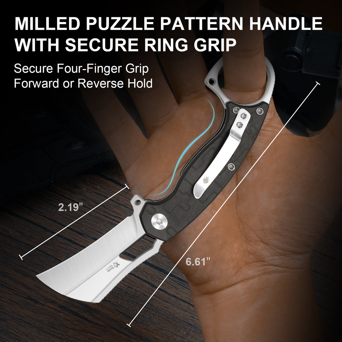 Milled puzzle pattern handle offers both visual appeal and reliable grip in varied conditions. The finger ring locks your hold in place, enabling confident four-finger control whether held forward or reverse. Available in Chocolate Glacier Richlite, Purple PC, and Black G10, combining distinctive style with lasting comfort and durability.