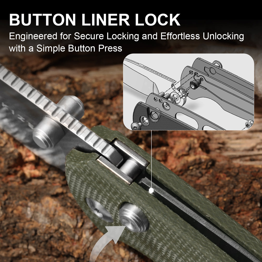 Incorporating an advanced button liner lock mechanism, it combines the reliability of a traditional liner lock with the convenience of button operation. The stainless steel lock bar ensures solid blade retention during use, complemented by a strategically positioned thumb stud that enables rapid one-handed deployment.