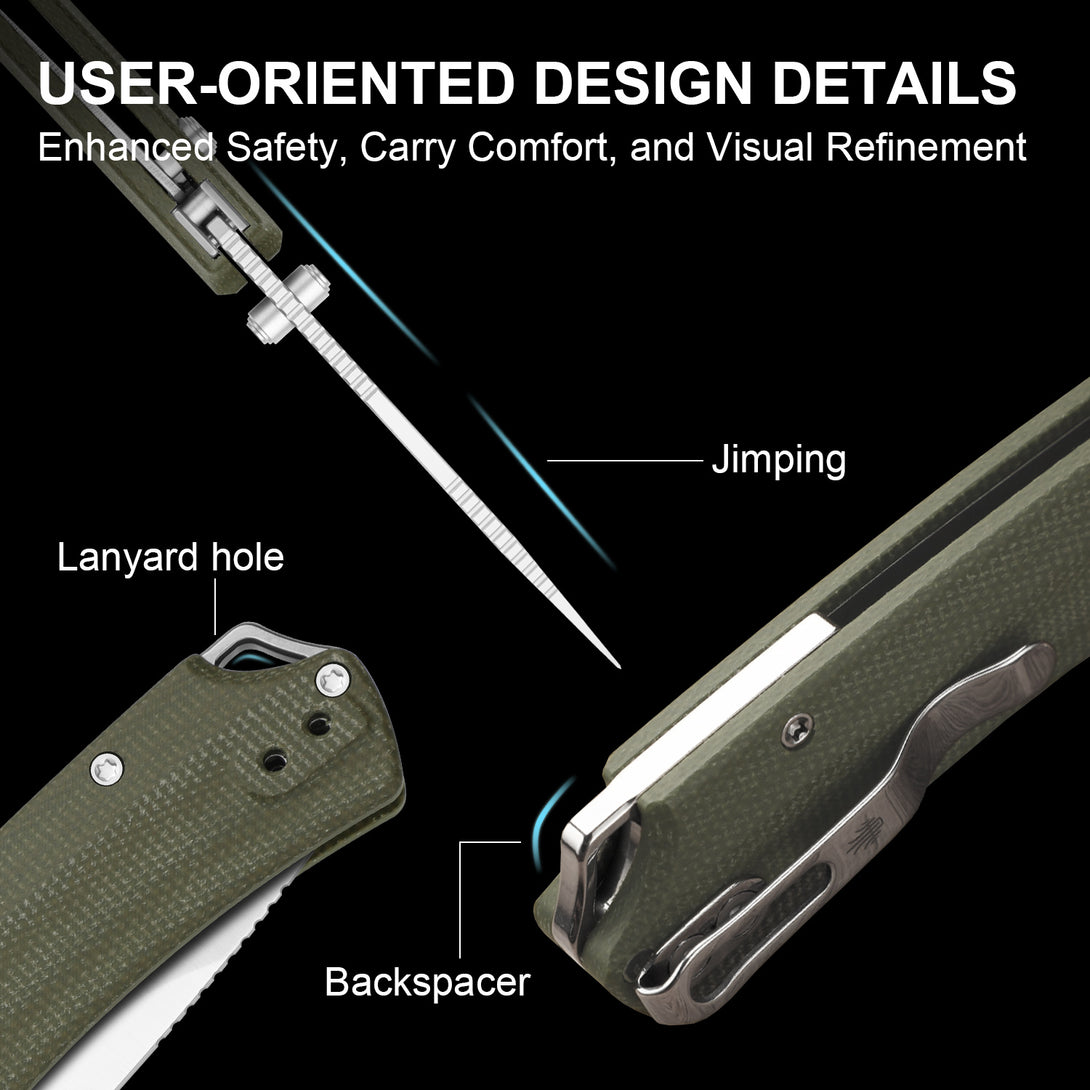 The jimping on the spine ensures a secure, non-slip grip even with wet hands or gloves. A reversible deep-carry pocket clip allows for discreet and adaptable carry on pockets or gear. The lanyard hole supports paracord attachment for extended carry options and personalization. Additionally, the finely crafted backspacer at the butt end not only completes the visual aesthetics but also reinforces the structural integrity of the handle.