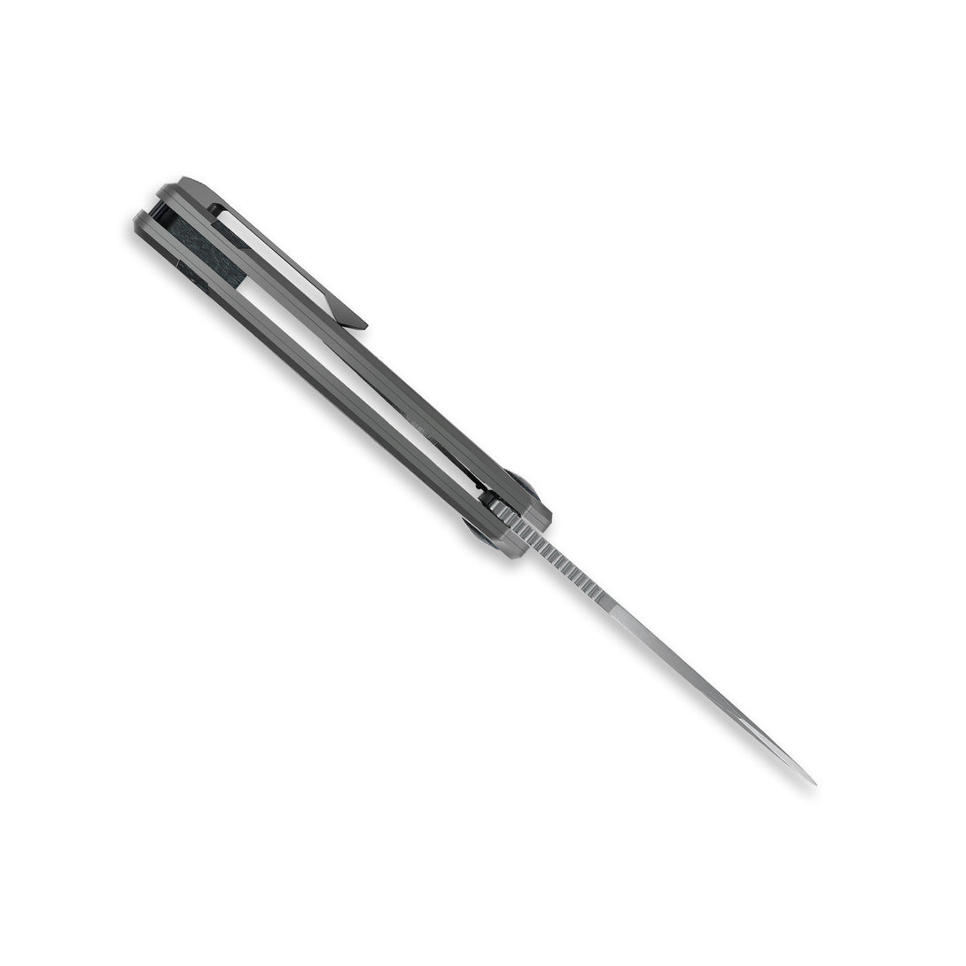 The Ara boasts a meticulously sculpted titanium handle with refined chamfering, accented by four elegant inlays and a precision-machined pivot collar for a sophisticated, design-forward look. The matching back-spacer echoes the handle's material, ensuring seamless visual harmony and a unified feel.