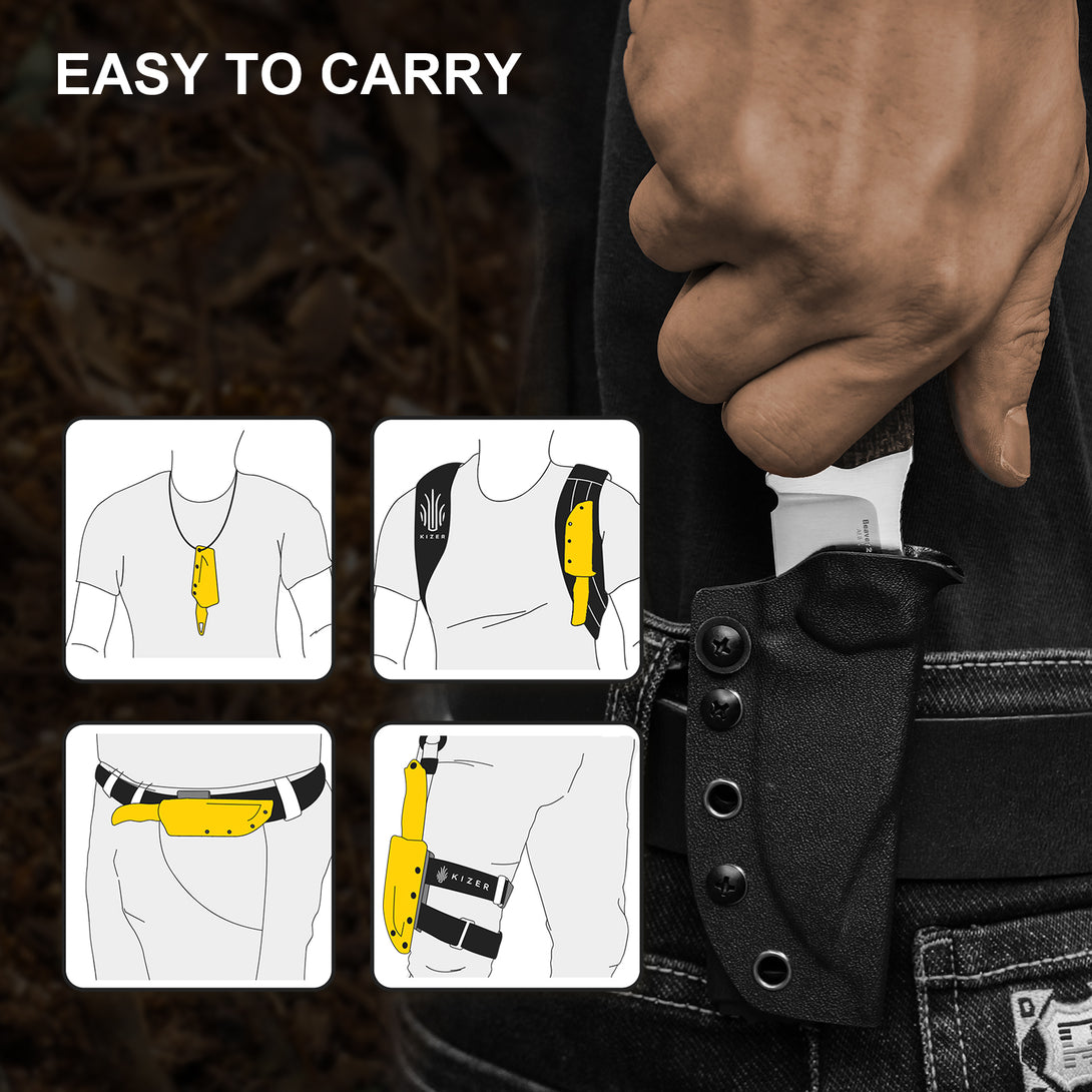 Each knife comes with a custom-molded Kydex sheath, delivering secure storage and effortless everyday carry. The sheath fully encloses the blade to prevent accidental contact with the sharp edge, improving safety during transport. Built for the outdoors, it offers quick access and can be easily mounted to your belt, pack, or gear for always-ready convenience.