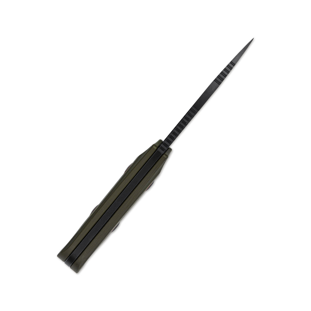 Ergonomic Olive Green G10 with multiple jimping for a secure grip.