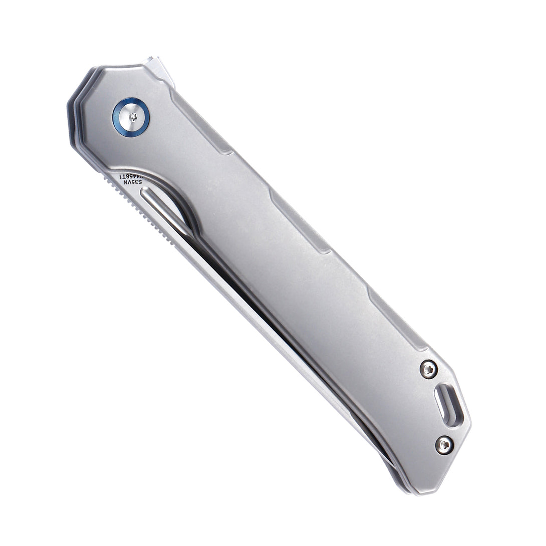 This Begleiter has a tanto blade made from CPM-S35VN. The handle is made from titanium with a blue pivot collar.This is an amazing titanium tanto style flipper edc knife. Extremely sharp right out of the box! Very smooth flowing action.Its pocket clip is easy for carrying.