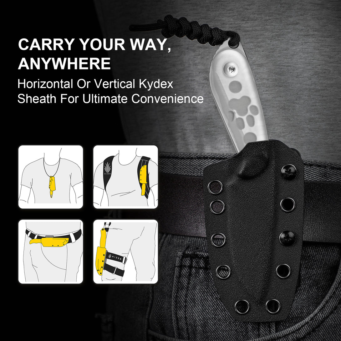Each Ice BUDDY comes with a durable Kydex sheath offering both horizontal and vertical carry options - adapt your knife to any situation. Whether you're camping, hiking, or tackling daily tasks, the full-tang construction ensures reliability when you need it most.