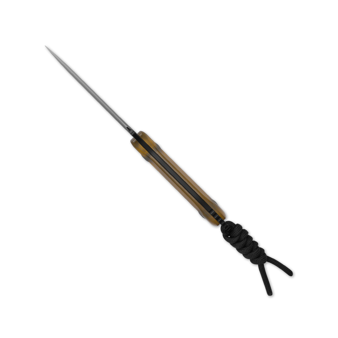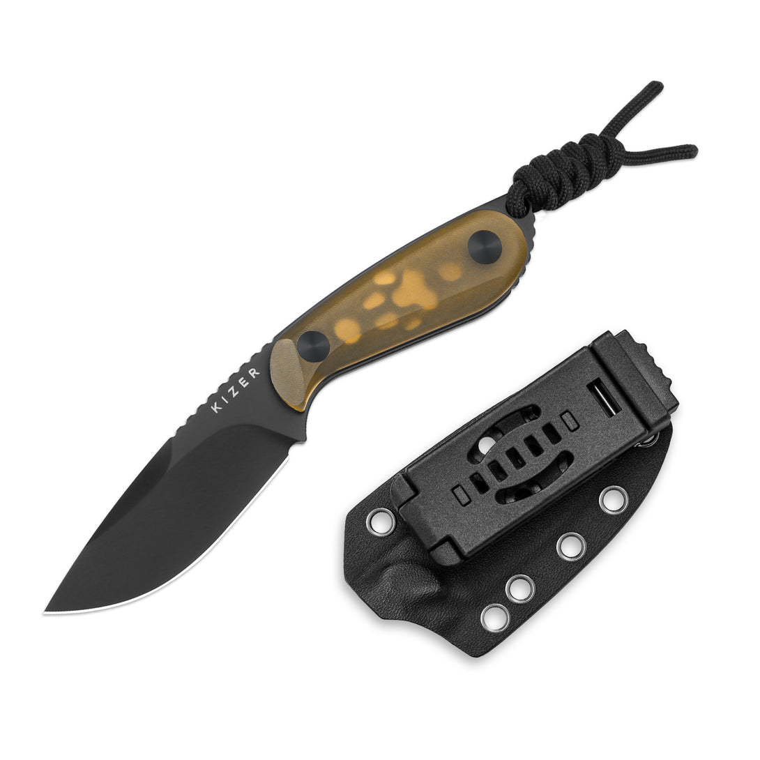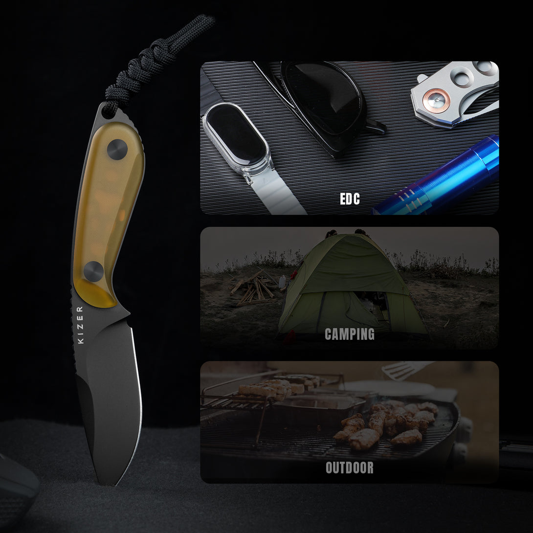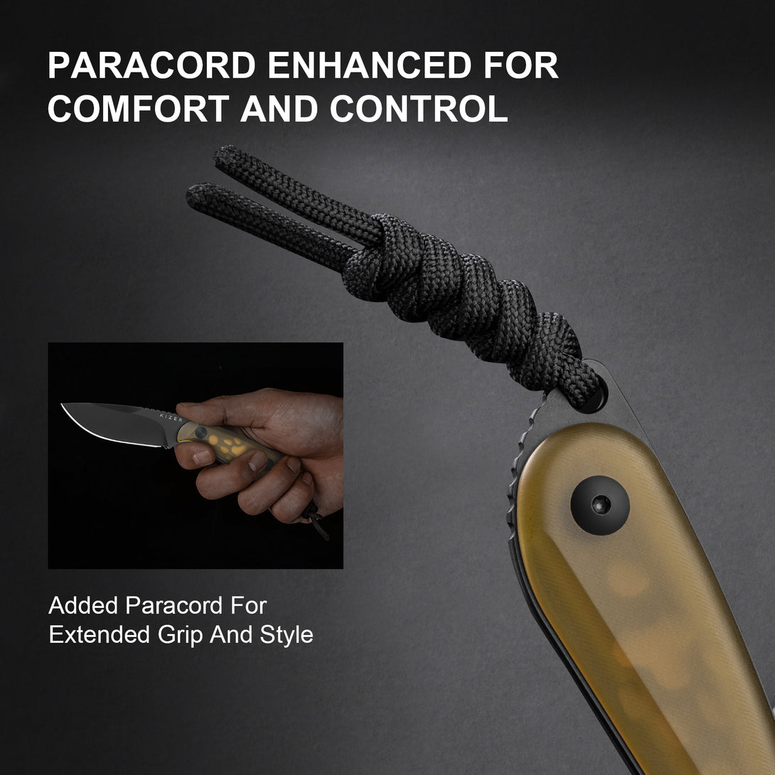 The BUDDY Knife stands out with its signature translucent honey-amber PEI handle, revealing playful puppy paw skeletonized cuts. Choose from multiple handle materials, including Micarta and G10, to match your style. Multi-section jimping and textured grips ensure complete control, whether you're camping, hiking, or tackling daily chores.