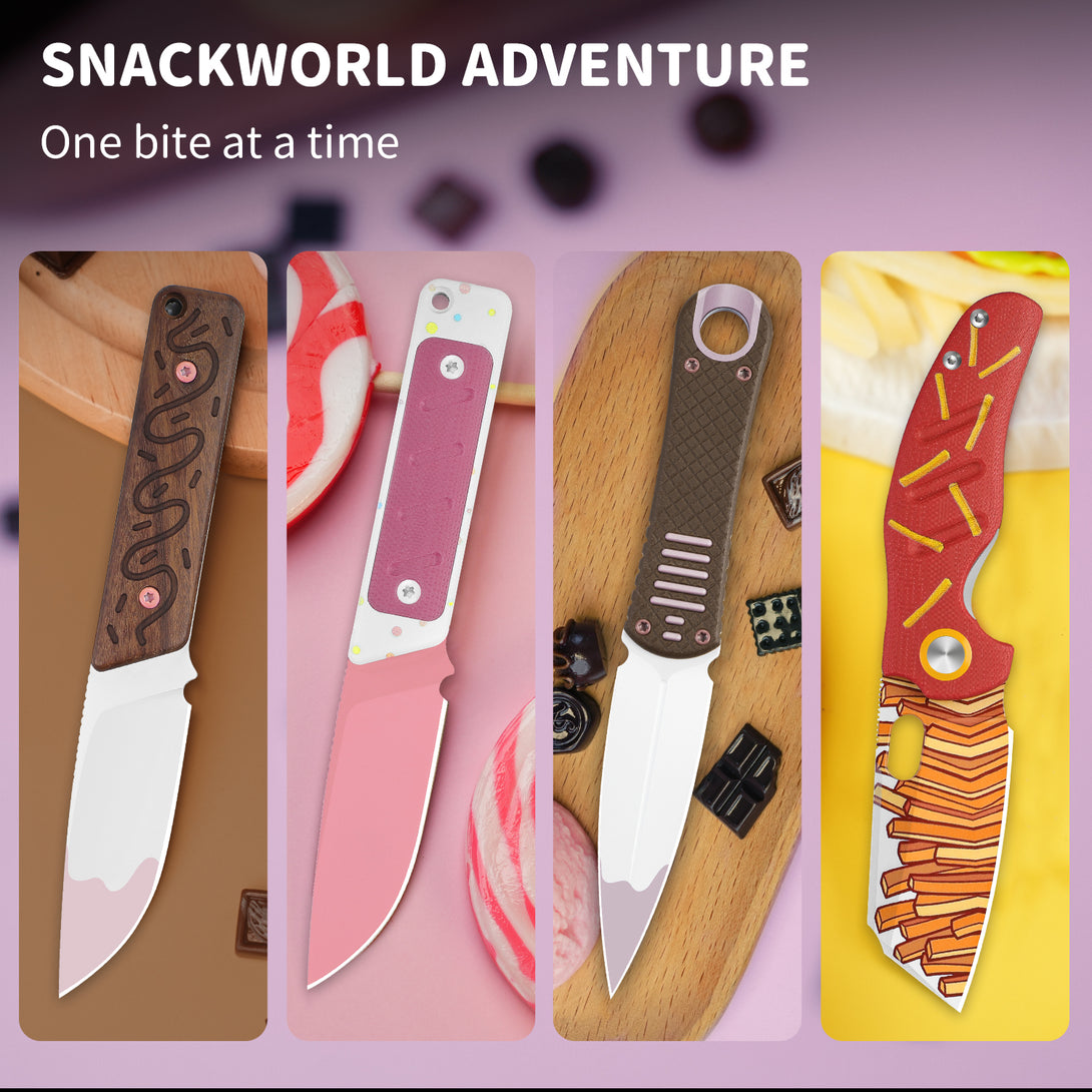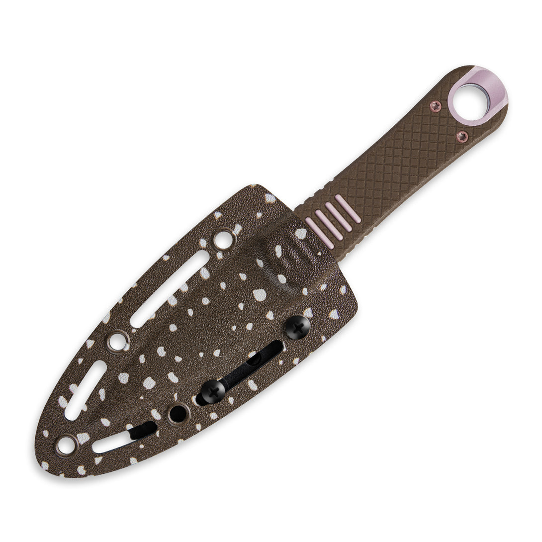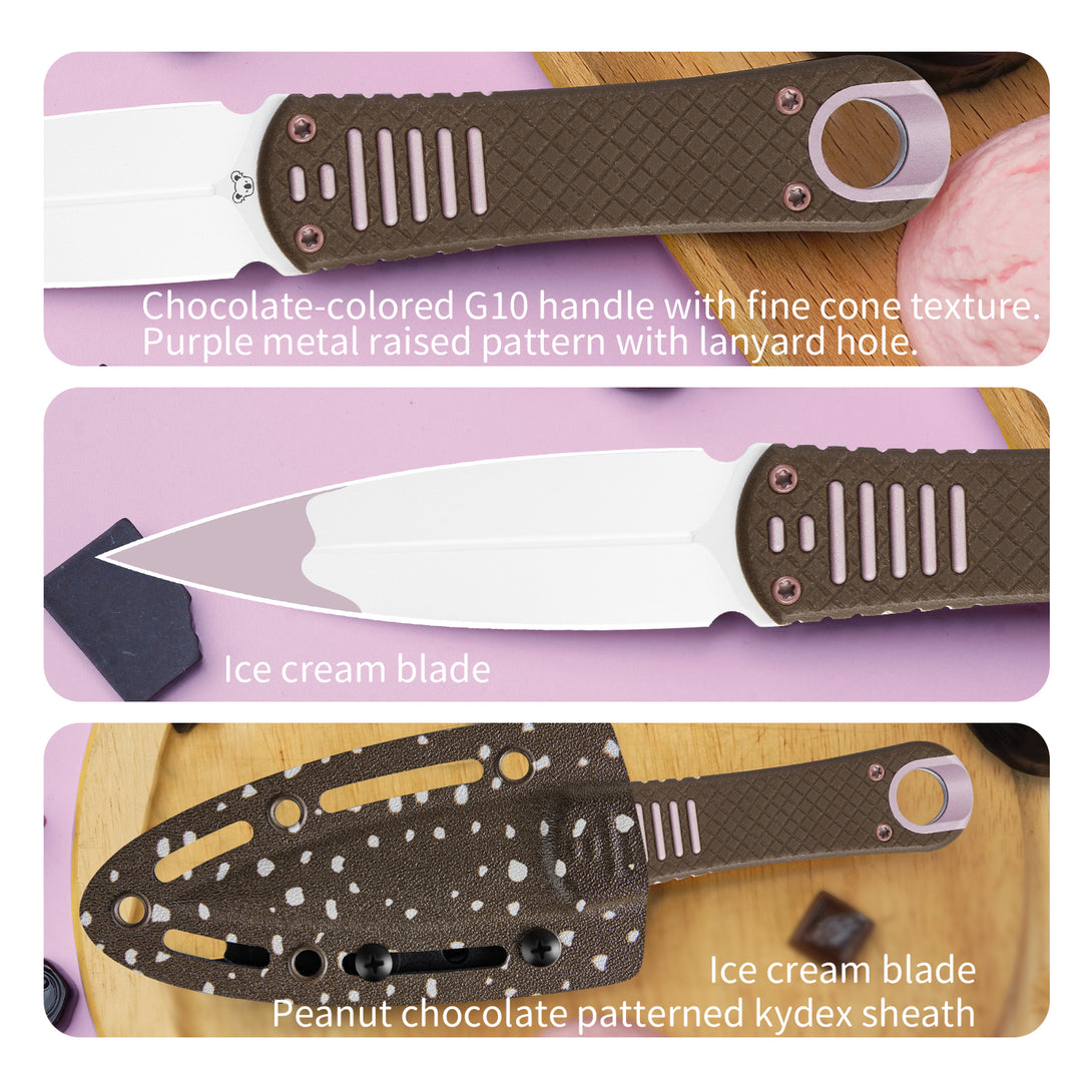 Inspired by everyone's favorite ice cream cone, this Hidden Agenda features a chocolate-brown G10 handle with authentic waffle cone texture for superior grip. The ice-cream coating blade delivers buttery-smooth cuts, while the peanut-speckled sheath adds a crunchy touch of fun.