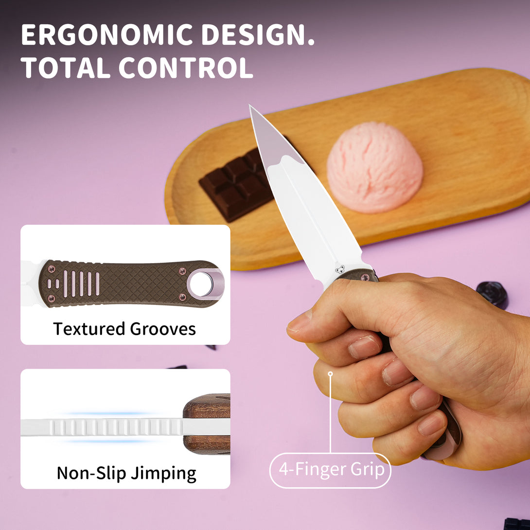 • Chocolate-brown G10 handle with authentic waffle cone texture for superior grip.
