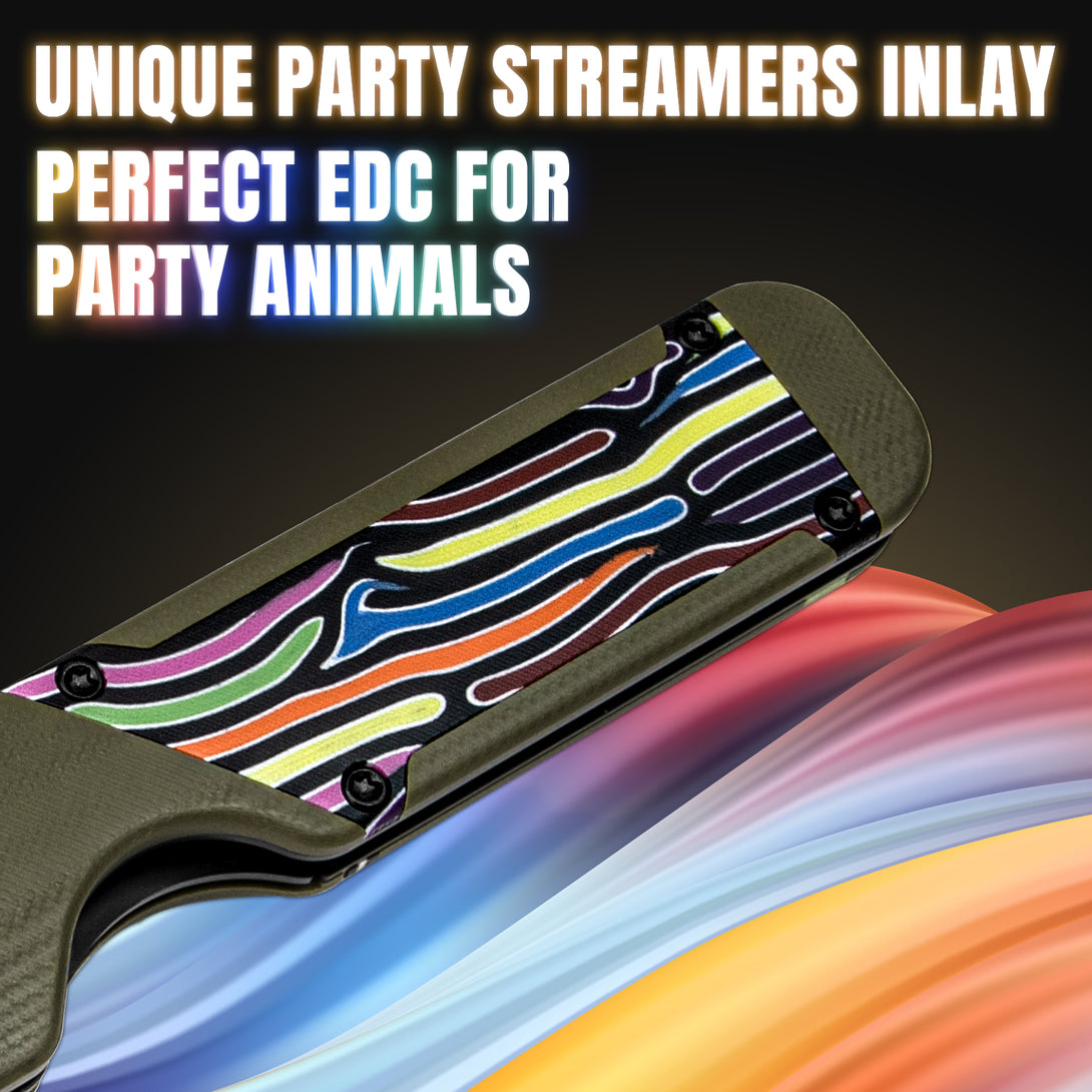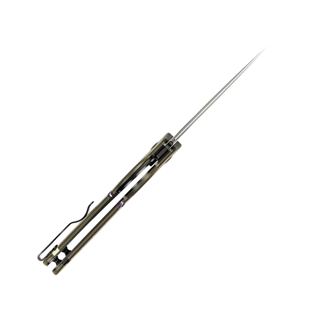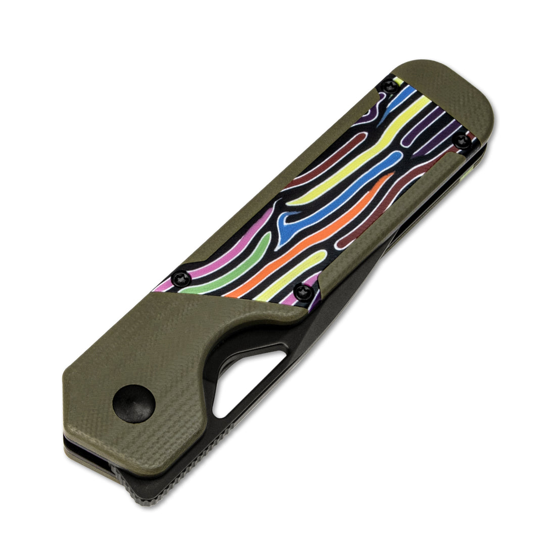 Featuring a stylish combination of olive green and party steamers G10, this handle is well-chamfered for a comfortable grip.