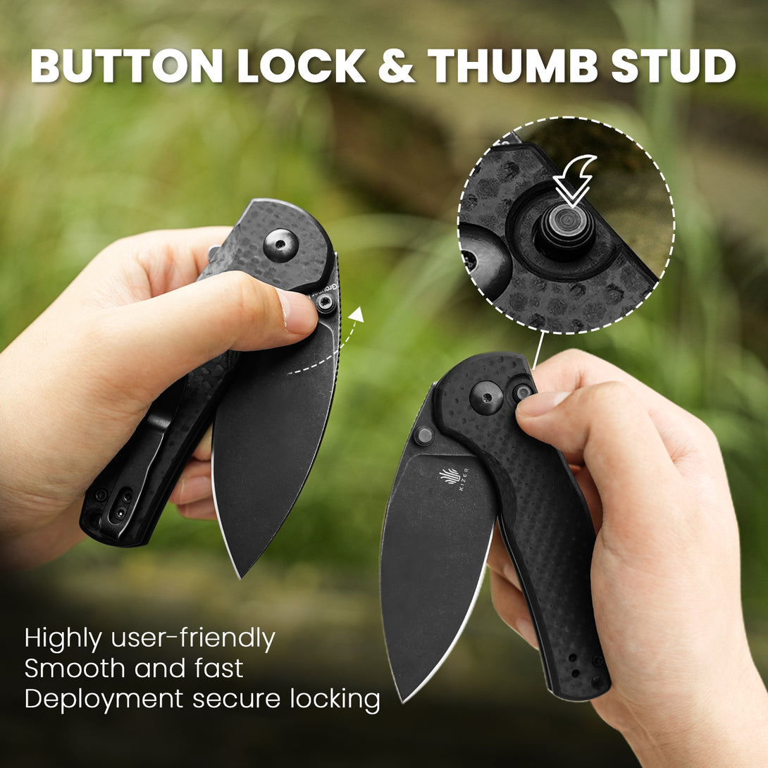 Designed with a flipper and button lock, this knife is highly user-friendly. It offers smooth and fast deployment, secure locking, and a blade path that avoids contact with fingers when closing, thus enhancing safety during use.