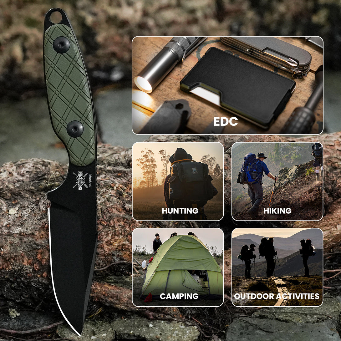 Its brown Micarta handle provides a light and secure grip, making it comfortable for extended use. The Muskrat comes with a rugged green Kydex sheath and lanyard hole, adding protection and ease of carry.