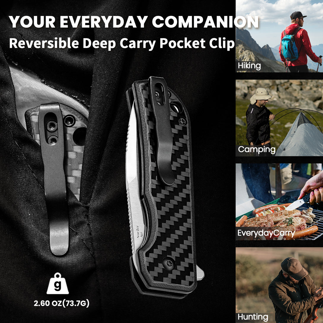 Featuring a G10 Carbon Fiber handle, it offers a luxurious appearance with its woven fabric-like pattern while maintaining its lightweight properties.