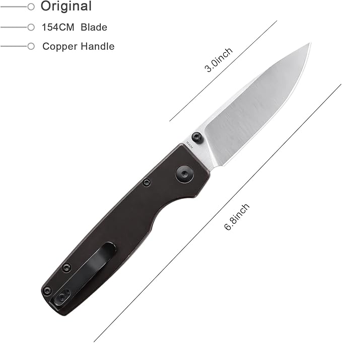 • The Kizer Original pocket knife is a perfect EDC knife, it is portable, strong, sharp, and easy to maintain. It was made of 154CM steel blade and copper handle.