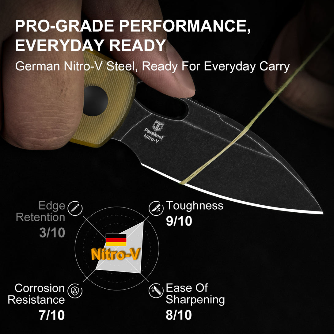 Crafted with Nitro-V steel (58-60 HRC), the blade resists corrosion and retains sharpness 30% longer than standard steel. This folding knife excels in EDC tasks like cutting ropes, opening packages, or food prep, making it a reliable companion for daily use.