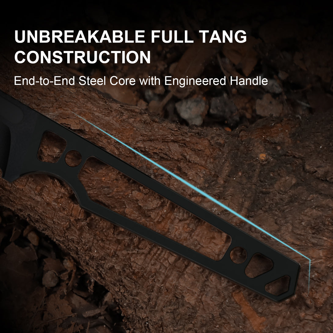 Full tang steel extends from blade tip to handle end for maximum durability. Strategically placed holes within the handle area reduce weight without weakening the core.