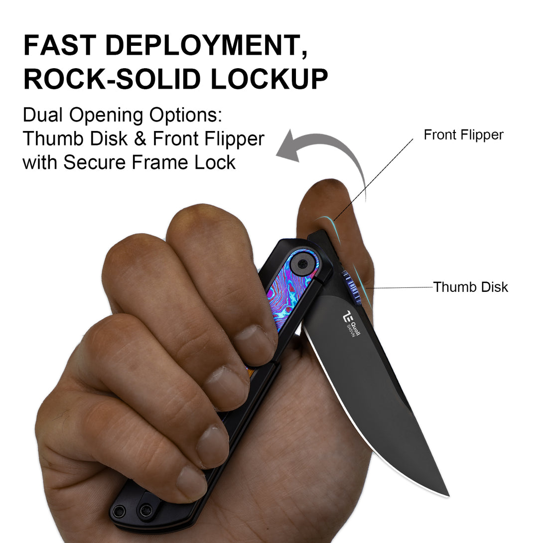 At the heart of the Quoll is a featherlight titanium handle, engineered for precision and personalized with swappable inlays. This modular system allows you to switch up your style in seconds and connects you to a community of fellow enthusiasts. Express yourself with a range of inlay options, including Rainbow Damascus, Crystallized Titanium, Titanium Damascus, and textured zirconium.