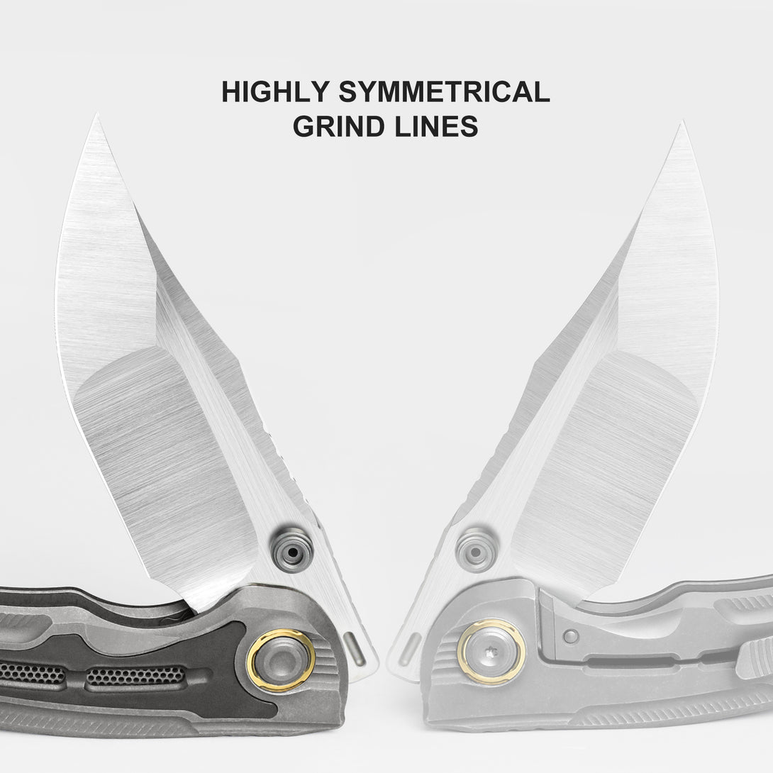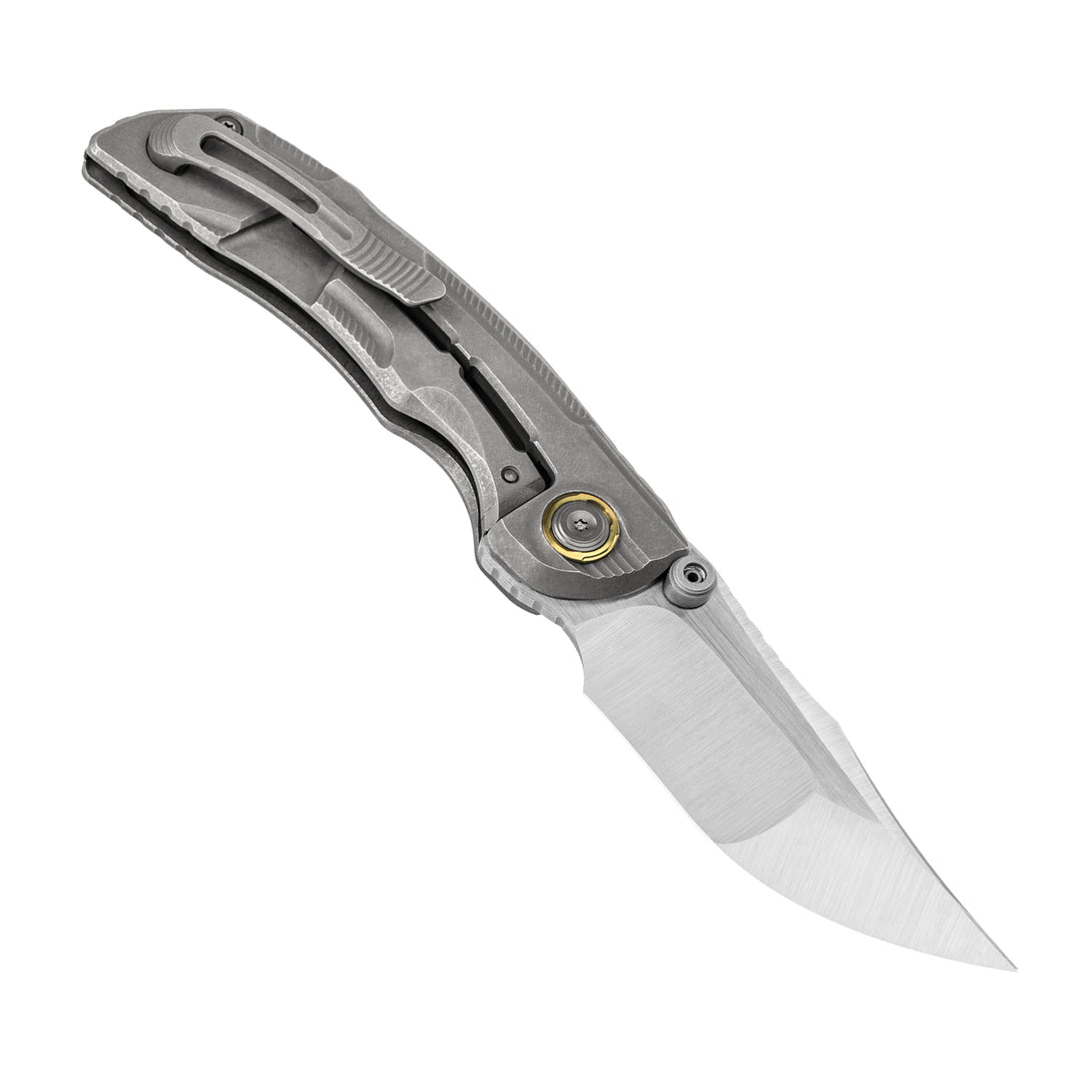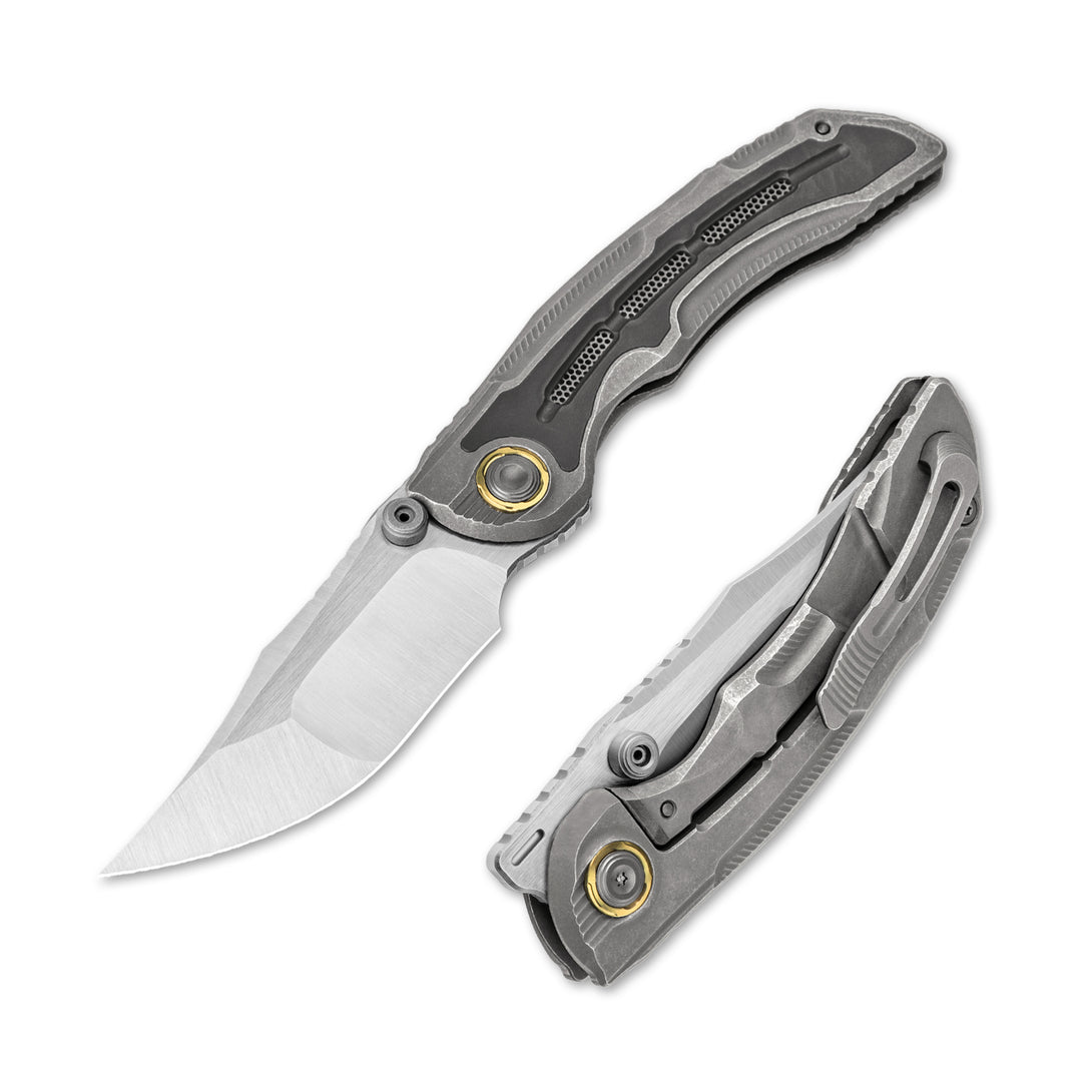 Heavy stonewashed titanium handle with a milled mesh pattern and robotic wing feather texture.