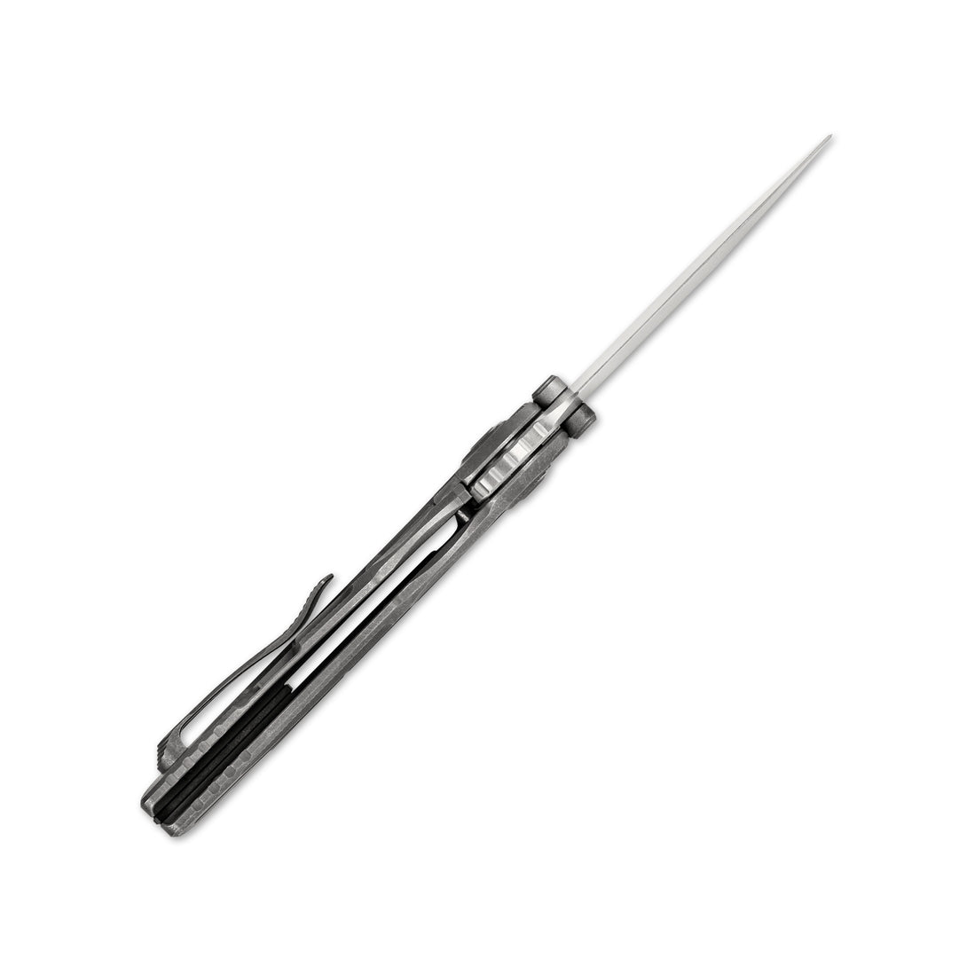 Heavy stonewashed titanium handle with a milled mesh pattern and robotic wing feather texture.