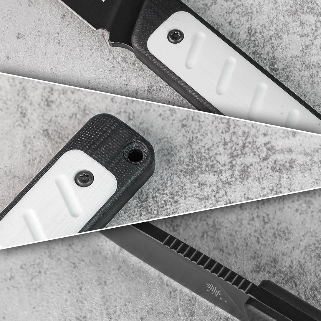 Its black-and-white G-10 handle ensures a lightweight, secure grip, making it comfortable for extended use.