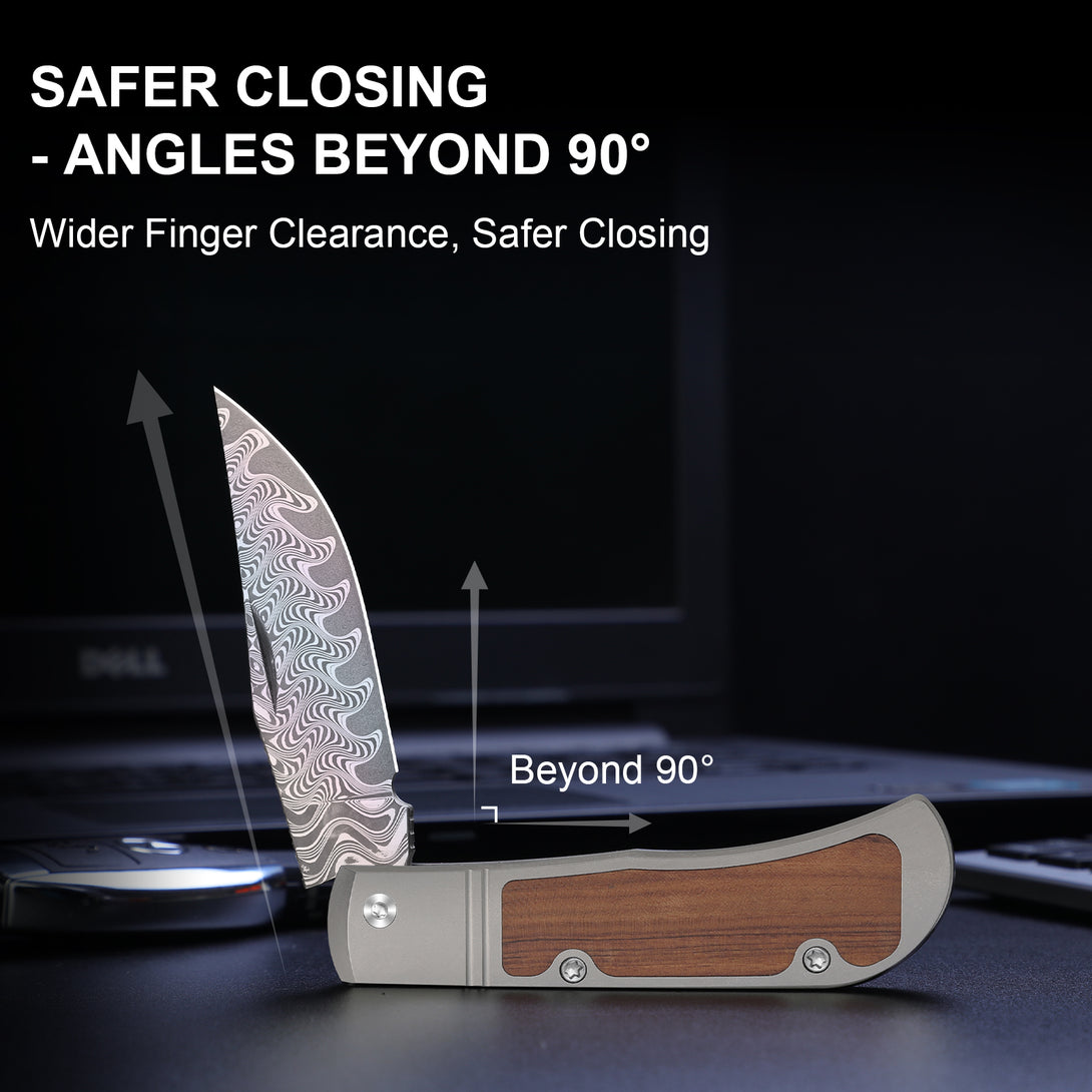 This folding knife features a safer closing design. Unlike regular non-locking knives that pause at about 90 degrees, this knife pauses at an angle beyond 90 degrees. This creates more space between the blade and your fingers when closing, making it much safer and reducing the chance of getting pinched.