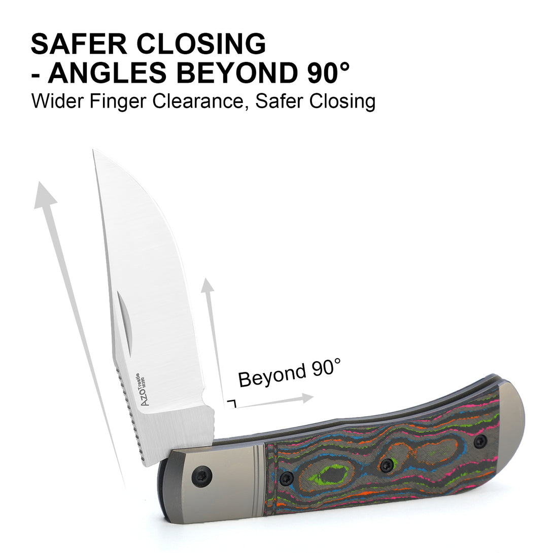 This folding knife incorporates an improved closing feature for added safety. While standard non-locking knives typically stop at a 90-degree angle, this model pauses at an angle greater than 90 degrees. This provides extra clearance between the blade and your fingers during closure, significantly improving safety and minimizing the risk of pinching.