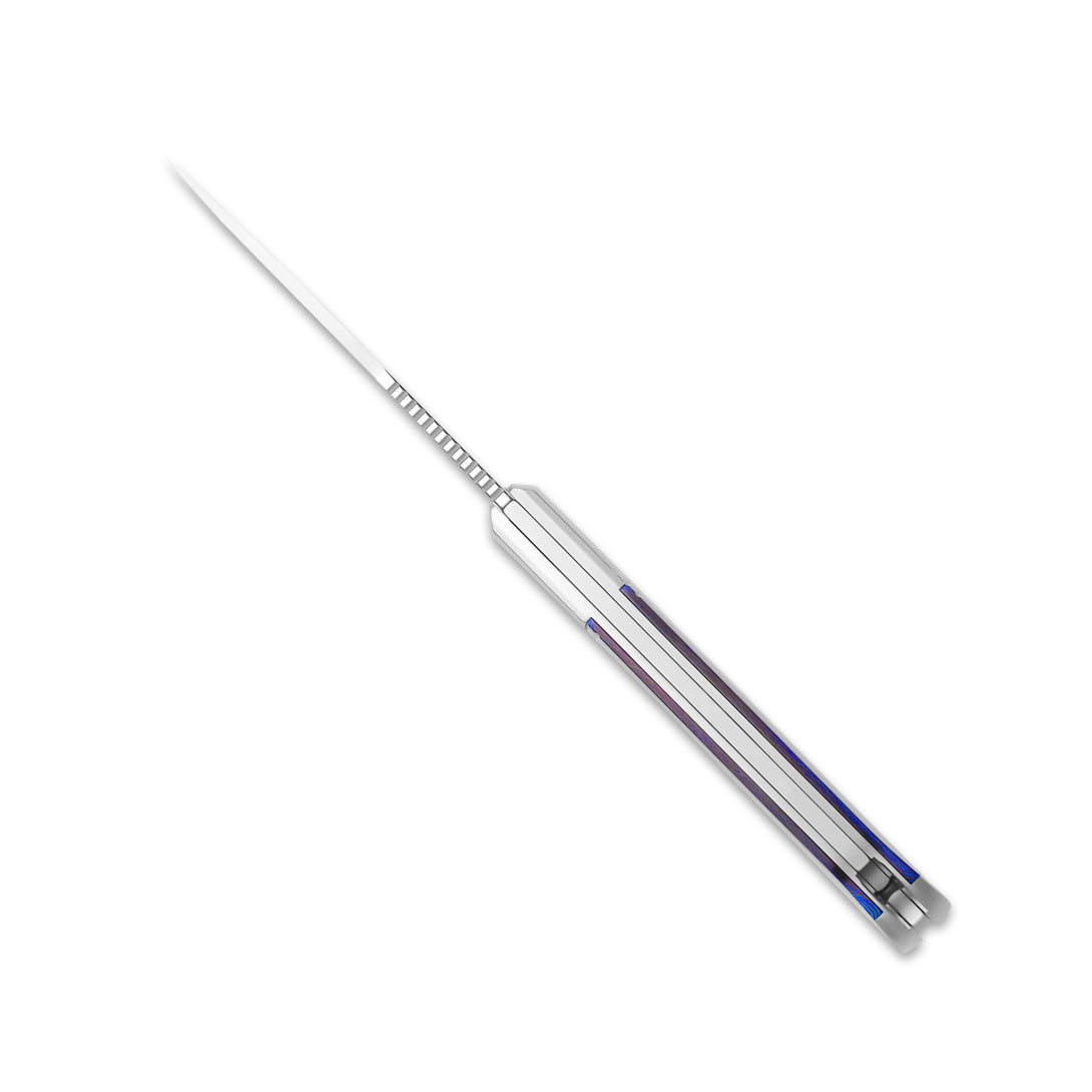 The handle is forged from titanium Damascus, creating multidimensional textures that shift like watercolor strokes in light. A deep indigo-violet iridescence glows under illumination, revealing crystalline metallic layers within. Designed with smooth, flowing lines that complement the blade, each handle is a one-of-a-kind collectible—no two patterns are alike.