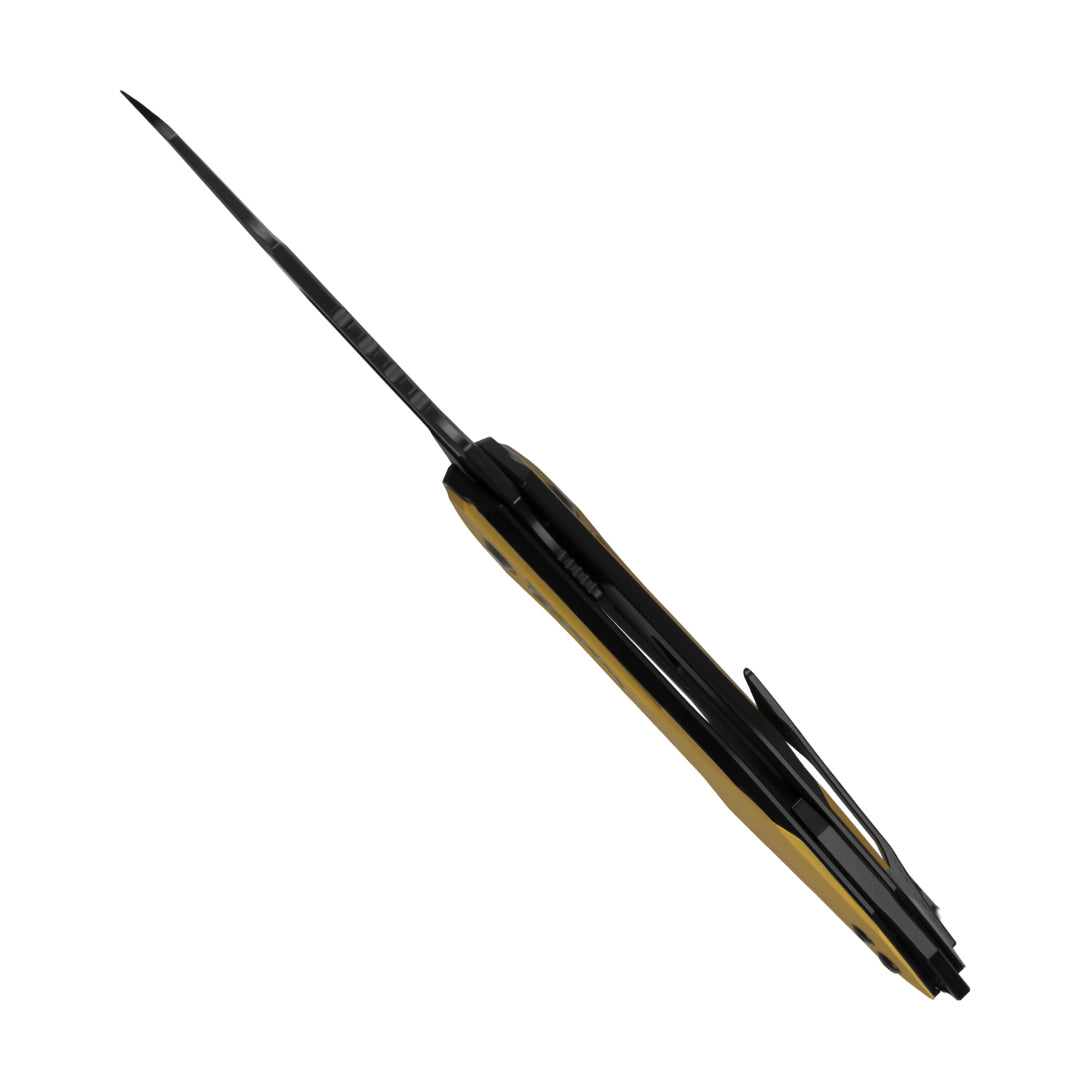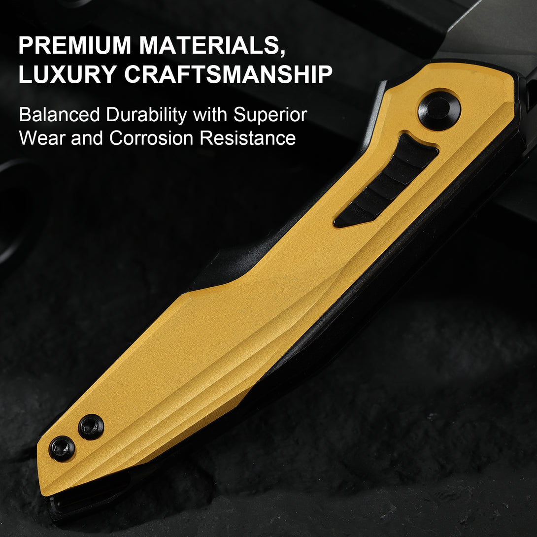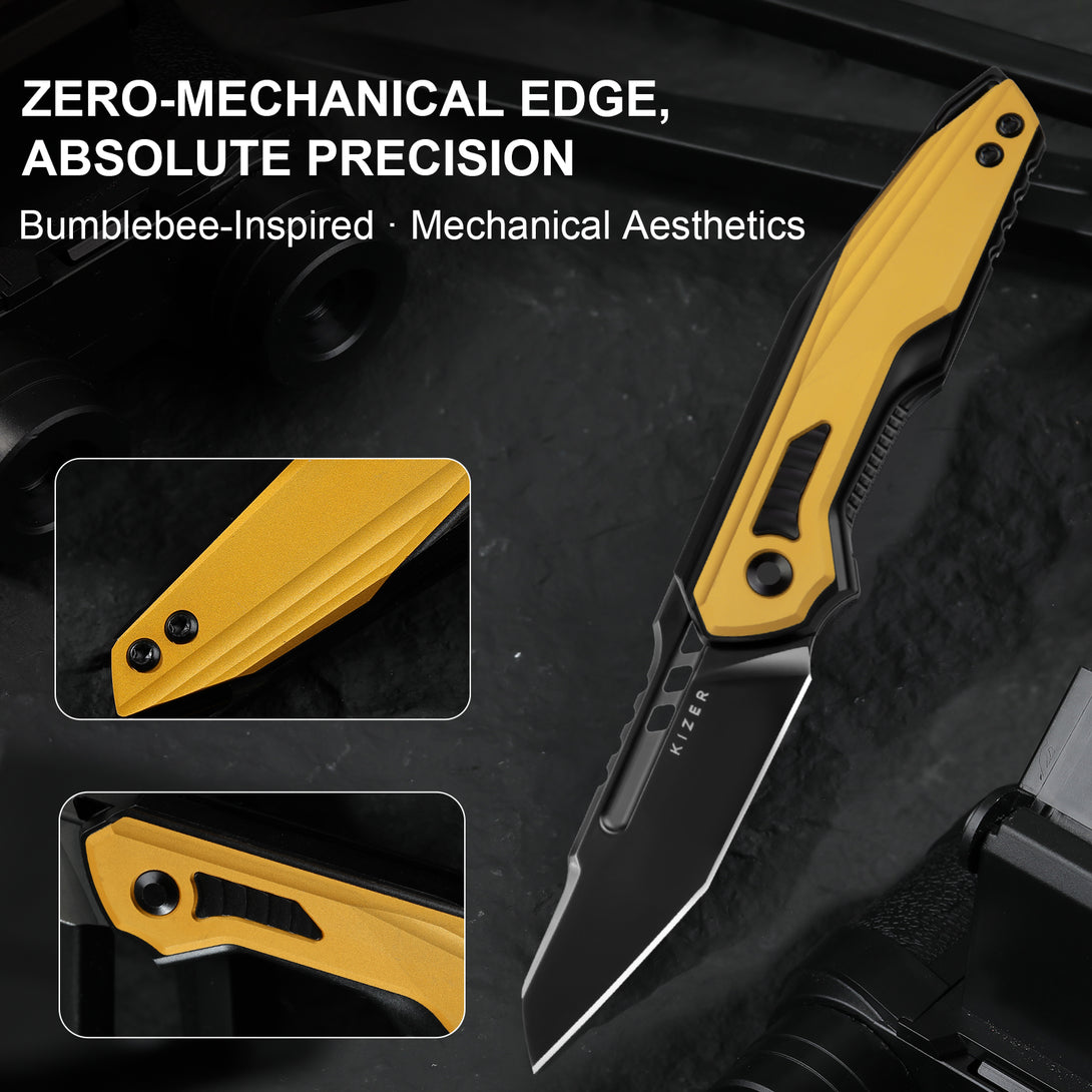 Features an S35VN blade with matte DLC-Ultra coating for enhanced wear and corrosion resistance,delivering a smooth, refined finish without harsh glare. Paired with a titanium handle and aluminum inlays in a bold yellow-black bumblebee contrast, it combines striking aesthetics with structural durability.